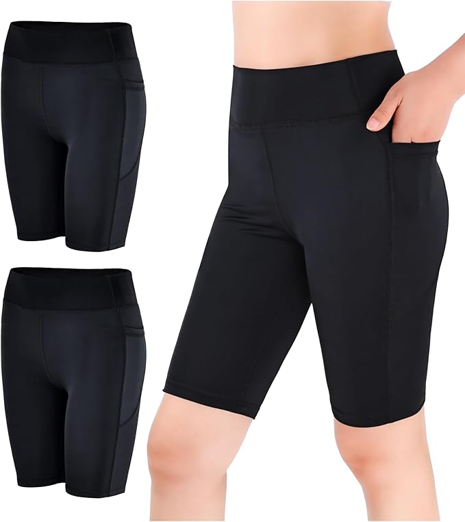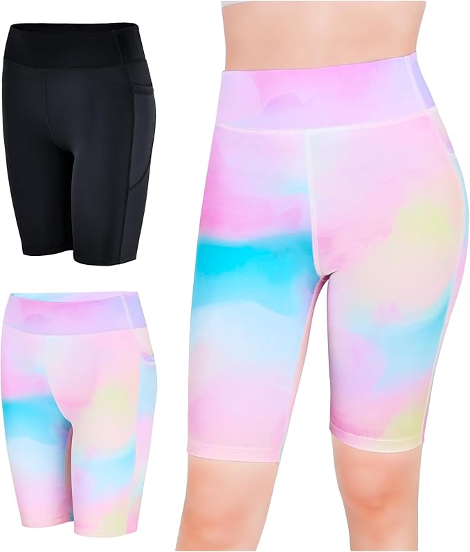 2pcs Girls Athletic Biker Shorts, Kids High Waisted Gymnastic Yoga Dance Running Cycling Shorts with Side Pockets