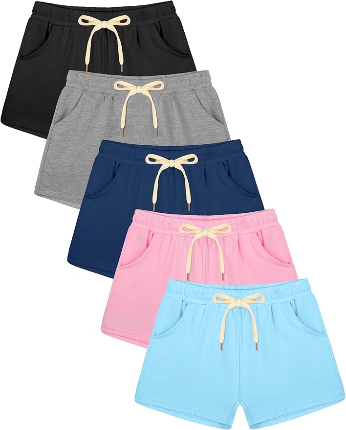 5 Pack Girls Athletic Shorts Active Performance Shorts Kids Summer Sports Shorts Running Yoga Shorts with Drawstring