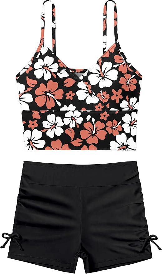 Girls Swimsuit V-Neck Floral Print Tankini Solid Color Shorts Swimsuits for Teen Girls 2Pcs Set Bathing Suits for Girls