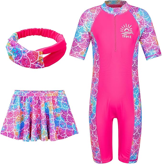 3 in 1 Sets Girls Swimsuits Short Sleeve Rashguard Suit UV 50+ Princess Swimwear Dress Skirt Zip 3-12Y