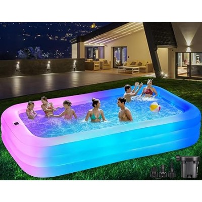 Large Solar Inflatable Pool with Lights, 130"x72"x22" Blow-Up Kiddie Pool with Air PUM, 7 Color Changed Family Swimming Pool for